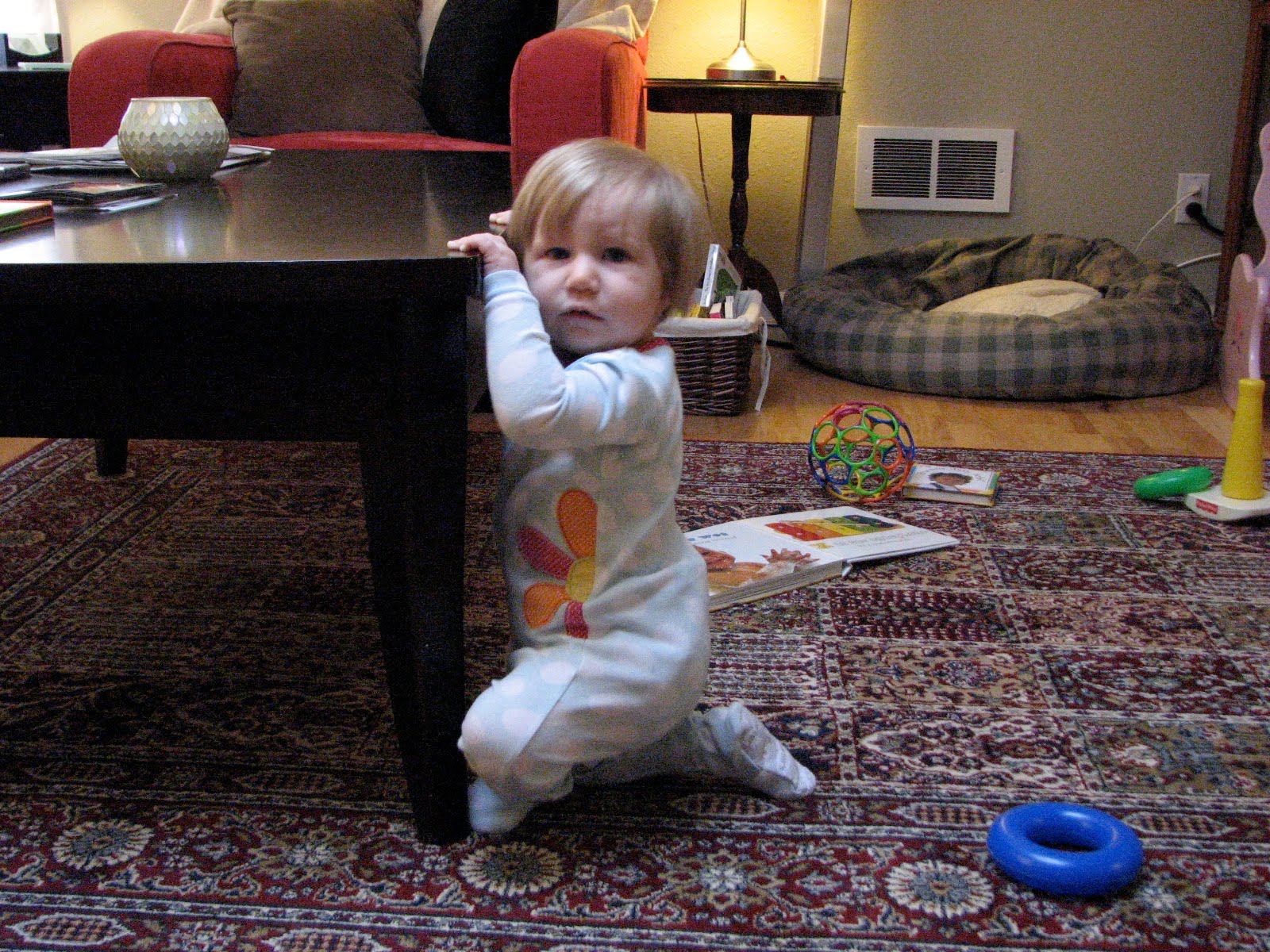 When Clare was a few months old we went to a friend’s first birthday party. I was watching the birthday boy and all of his little friends and thought to myself “those one-year-olds are certainly busy.” Well, now that I have my very own I agree with my first impression. Our particular almost-one-year-old is awfully busy crawling, exploring, tasting, pulling up, climbing over, grabbing, talking, lifting, rolling, hitting things together, throwing them away, etc. Every once in a while she’ll sit down with one of her beloved books, but for the most part Clare has places to go and people to see. Since my nickname for her is Bug, these days she’s a Busy Bug or a Doodle Bug.