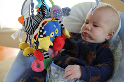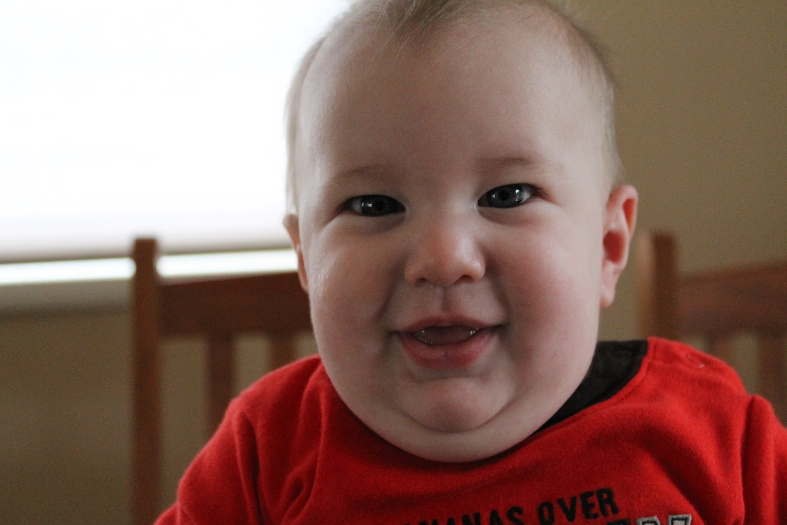 Sammy has what J calls “elephant trunk arms” where he can reach well beyond where you think he can to grab things. His aim is spot-on and very, very strong. J was holding Sammy and Sam reached over J’s should and grabbed a picture off the wall. Seriously – an 8×10 picture right off the wall. Fortunately we caught the picture before it landed on the floor. In the picture above Sam was joyously picking handful after handful of grass.